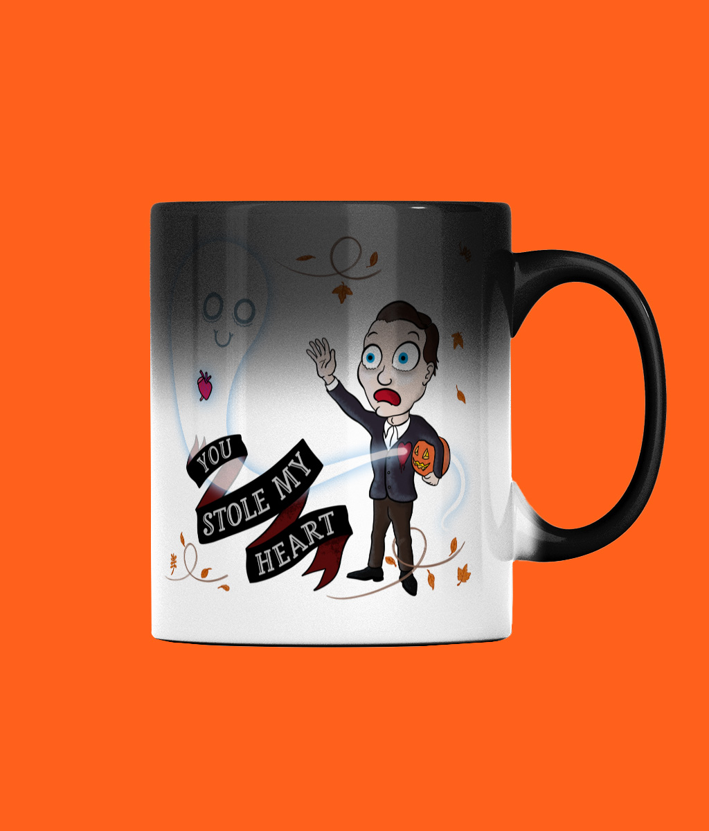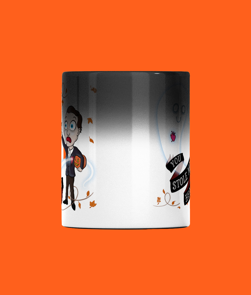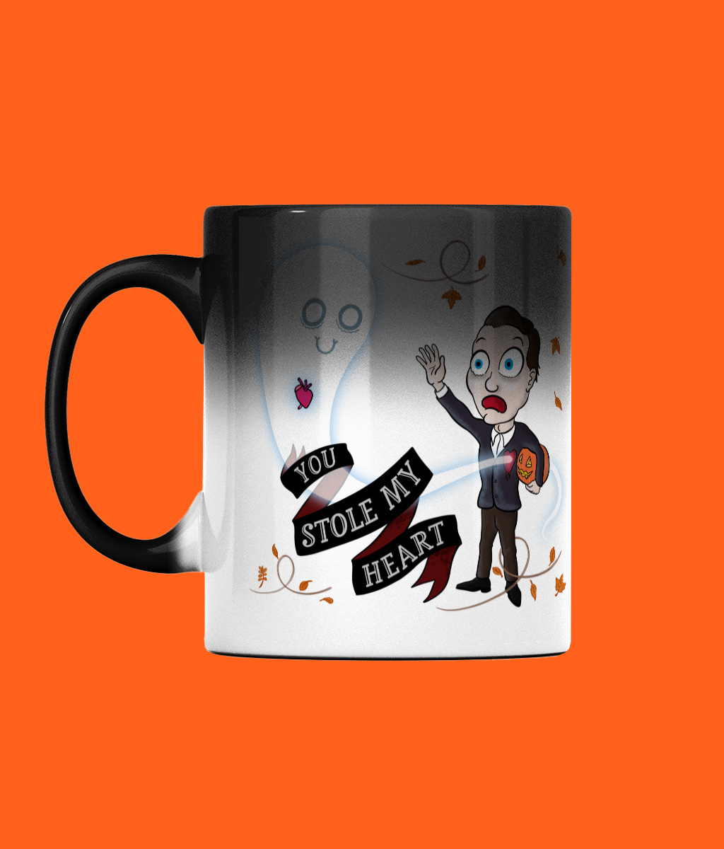 - Heat-sensitive mug reveals design when hot.